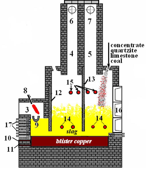 基于富氧侧吹熔池熔炼工艺本身的特点和优势,该工艺不断被行业认可,越来越多铜冶炼企业选择富氧侧吹工艺。国内有多家大型铜冶炼企业采用富氧侧吹工艺,熔炼炉直接产出白冰铜,熔炼渣选矿。