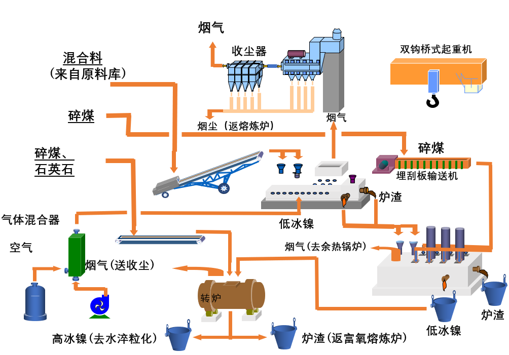 低冰镍富氧侧吹炼生产高冰镍工艺:该工艺自动化程度高、现场作业环境好,烟气稳定、SO2浓度高有利于制酸,吹炼系统可以脱离熔炼系统冷料独立运行,炉体运行周期长,镍钴回收率高。该工艺还可用于镍矿直接生产高冰镍。